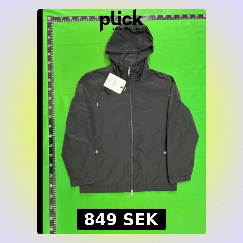 Snygg svart vindjacka från Moncler med huva och dragkedja framtill. Jackan har två sidofickor med tryckknappar, justerbar dragsko i huvan och Moncler-logga på ärmen. Materialet är tunt och vattenavvisande, perfekt för blåsiga dagar.