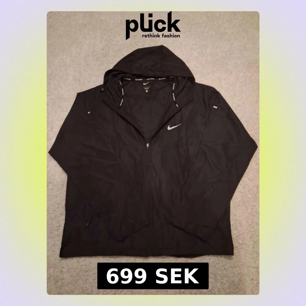 Snygg svart vindjacka från Nike med dragkedja och huva. Jackan har Nike-logga på bröstet och texten 'Nike Running' på insidan av huvan. Perfekt för löpning eller när du vill ha en lätt jacka. Tillverkad i tunt, vindtätt material.