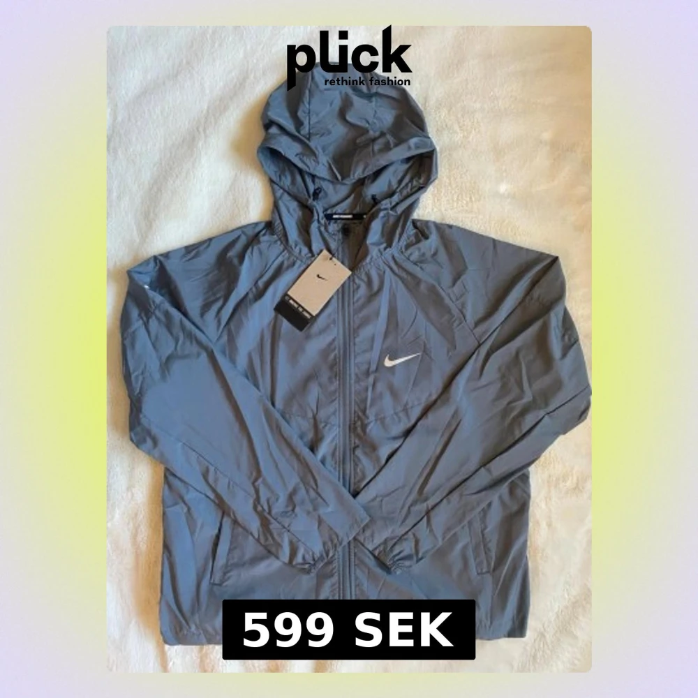 Snygg grå vindjacka från Nike med huva och dragkedja framtill. Jackan har två sidofickor, elastiska muddar vid ärmsluten och en vit Nike-logga på bröstet. Tillverkad i lätt och tunt material som passar perfekt för blåsiga dagar.
