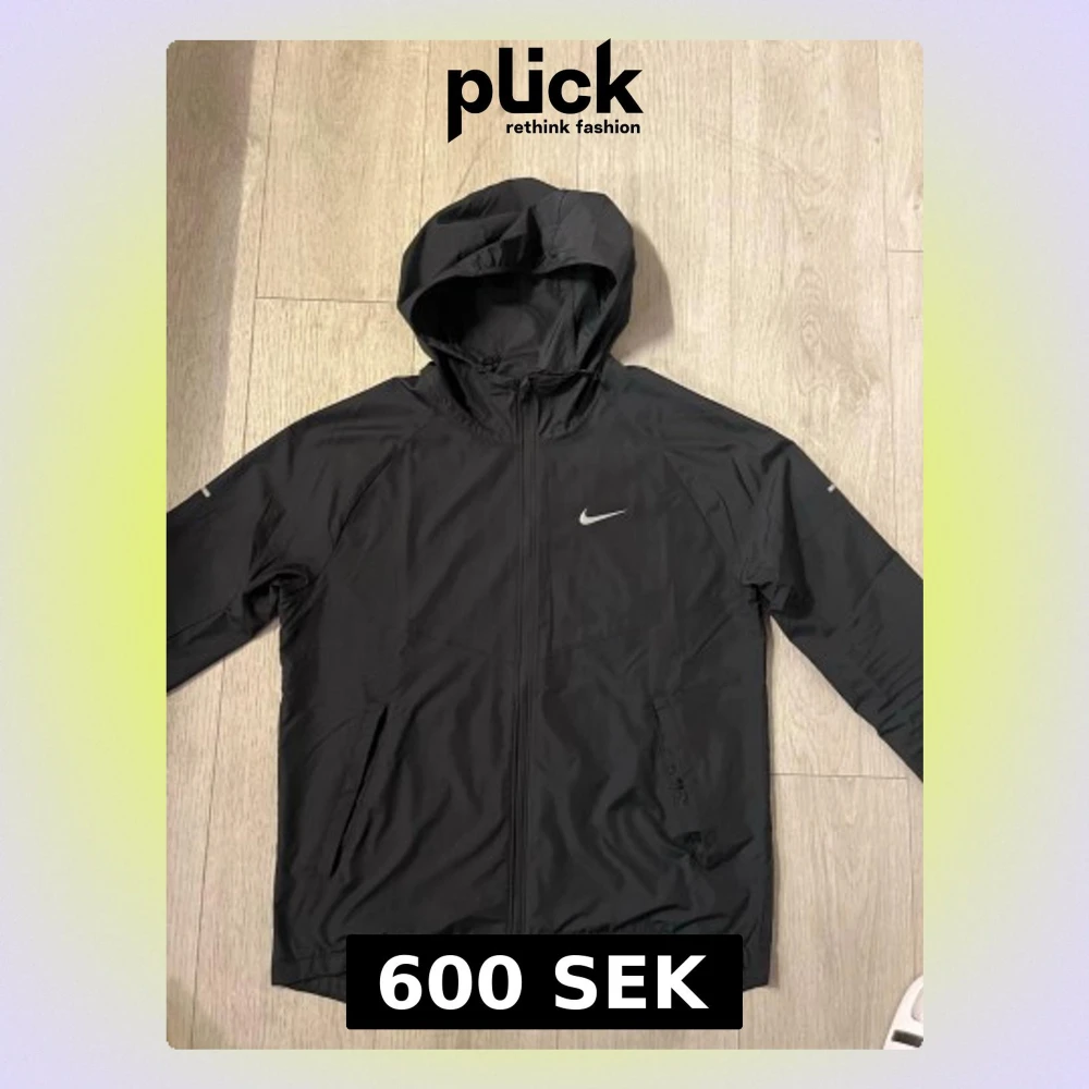 Snygg svart vindjacka från Nike med dragkedja framtill och justerbar huva. Jackan har två sidofickor med dragkedja och en vit Nike-logga på bröstet. Tillverkad i lätt och vindtätt material, perfekt för blåsiga dagar.