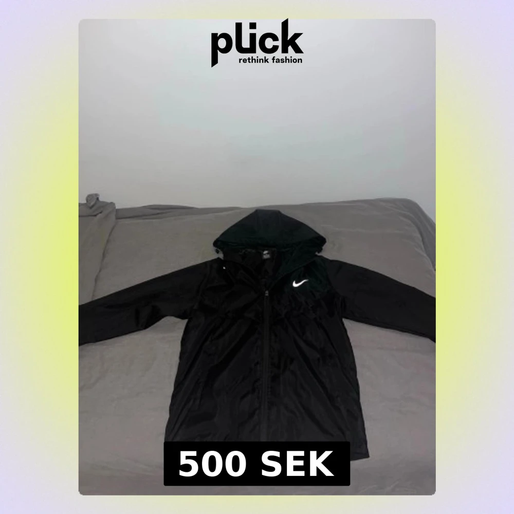 Snygg svart vindjacka från Nike med reflektiv logga på bröstet. Jackan har dragkedja framtill, huva och långa ärmar. Tillverkad i lätt och tåligt material som skyddar mot vind. Perfekt för dig som vill ha en sportig och stilren look. Det står storlek M men den passar storlek S.