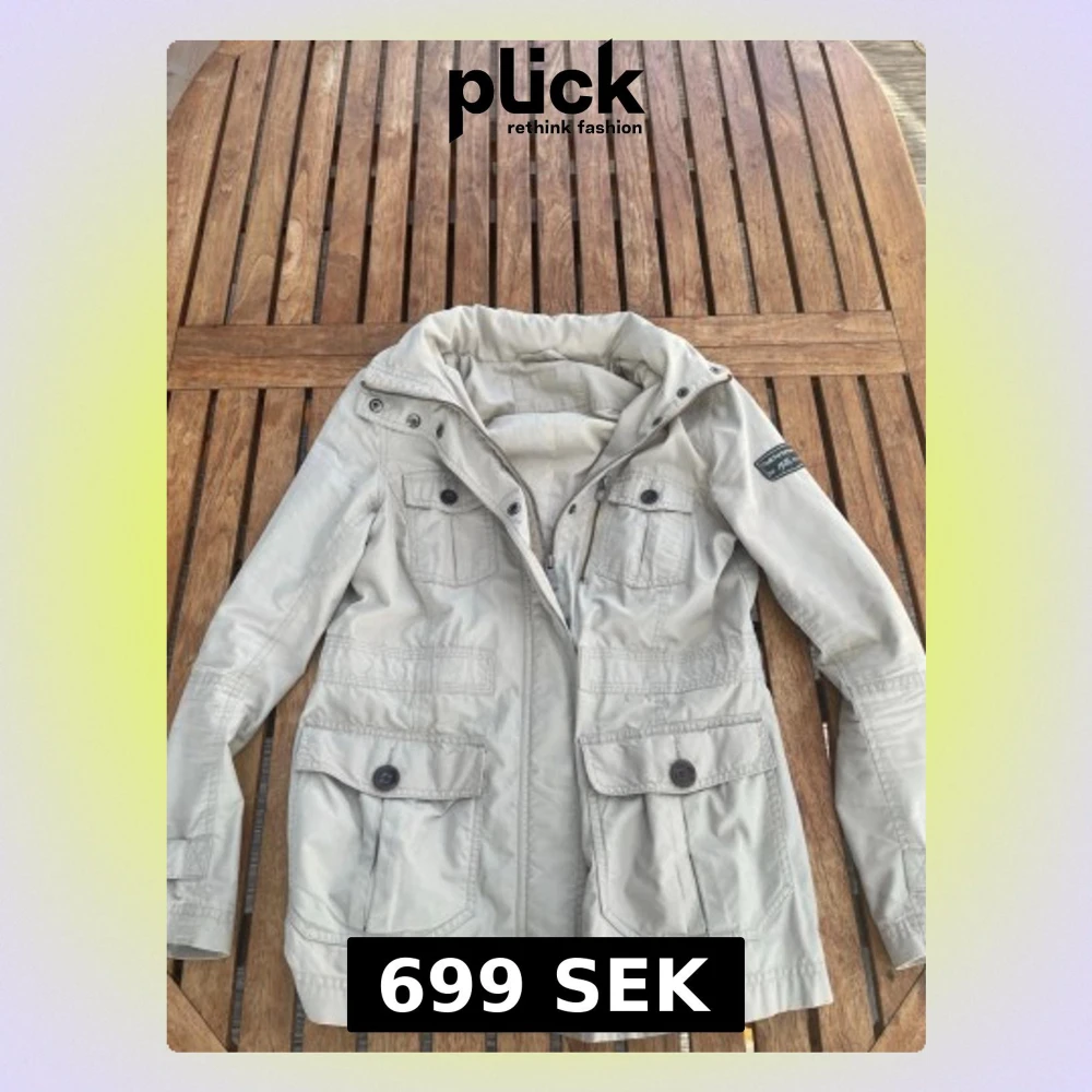 Snygg beige vindjacka från Peak Performance med fyra stora fickor framtill, dragkedja och knappar. Jackan har hög krage och patch med logga på ärmen. Perfekt för blåsiga dagar och enkel att matcha med olika outfits.