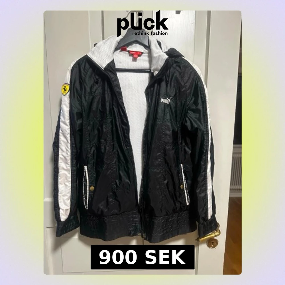 Svart vindjacka från Puma i samarbete med Ferrari. Jackan har vita detaljer längs ärmarna, Ferrari-logga på ärmen och ryggen samt en rand i Italiens färger på baksidan. Huva, dragkedja och fickor med tryckknappar. Materialet är glansigt och lätt. Den är ganska liten så skulle säga att den passar S-M. Armarna är lite smala för L