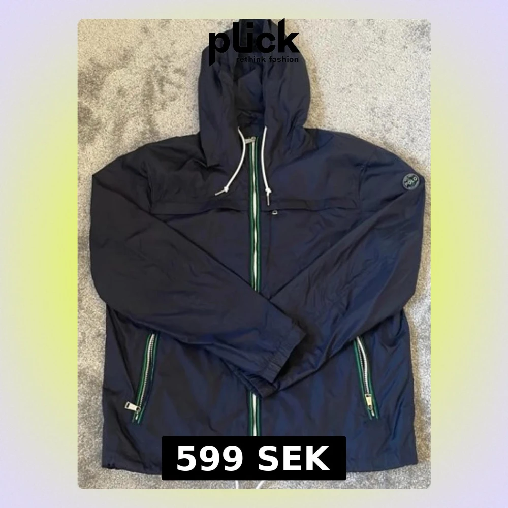 Snygg marinblå vindjacka från Polo Ralph Lauren med huva och vita dragskor. Jackan har gröna och vita detaljer på dragkedjorna samt två sidofickor med dragkedja. Liten Polo-logga på ärmen. Tillverkad i lätt, vindtätt material.