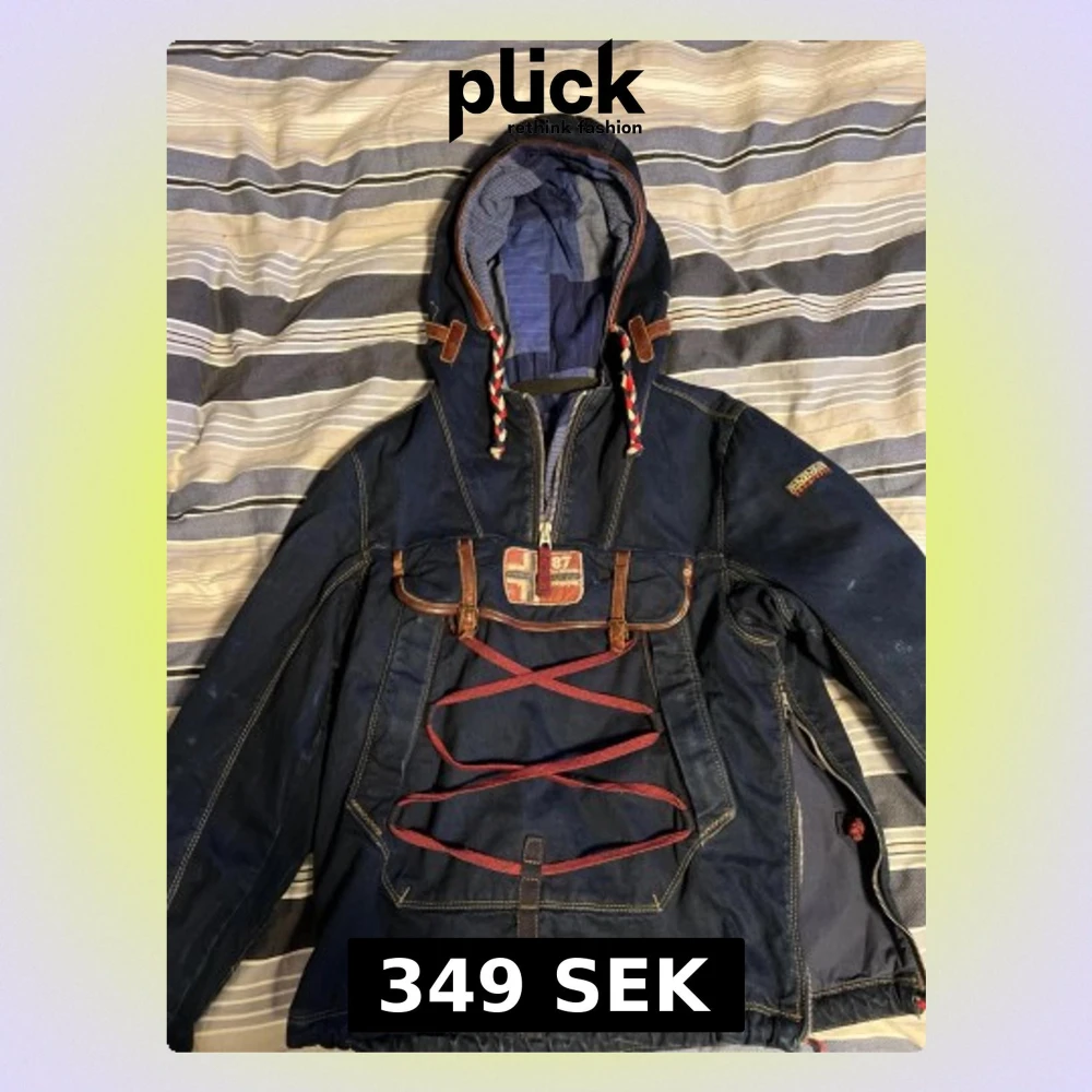Snygg mörkblå vindjacka från Napapijri med huva, halv dragkedja och dekorativa röda snören framtill. Jackan har norska flaggan som patch på bröstet, bruna läderdetaljer och broderad logga på ärmen. Perfekt för dig som vill ha en unik och sportig look.