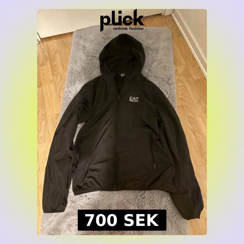 Snygg svart vindjacka från EA7 Emporio Armani med huva och dragkedja framtill. Jackan har två sidofickor med dragkedja och vit logga på bröstet. Perfekt för blåsiga dagar och enkel att matcha med streetwear. Materialet är lätt och smidigt.