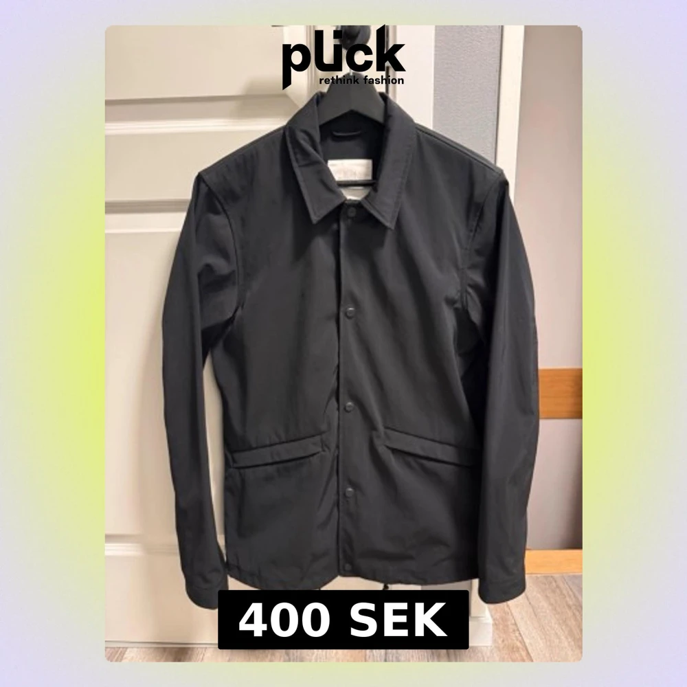Stilren svart vindjacka med klassisk krage och tryckknappar framtill. Jackan har två snedställda fickor och dragsko i nederkant för justerbar passform. Materialet är tunt och smidigt, perfekt för blåsiga dagar. Enkel och clean design utan synliga loggor.