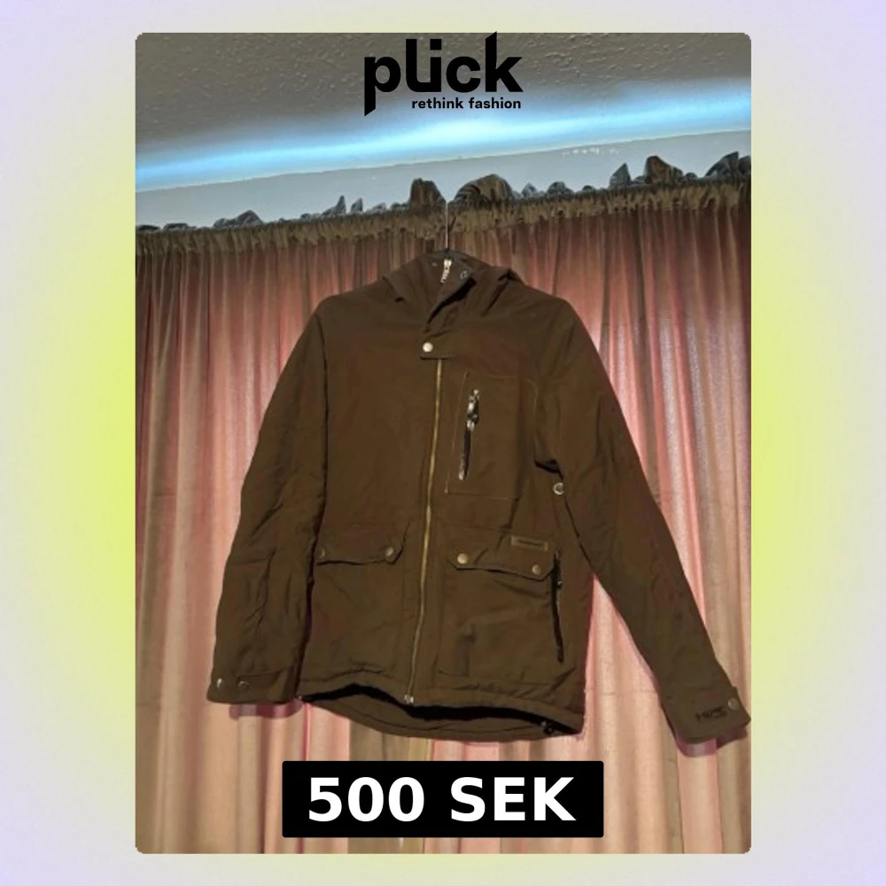 Snygg brun vindjacka med huva och dragkedja framtill. Jackan har flera fickor med knappar och en bröstficka med dragkedja. Justerbara ärmslut och diskret logga på ärmen. Perfekt för blåsiga dagar och enkel att matcha. Från peak performance