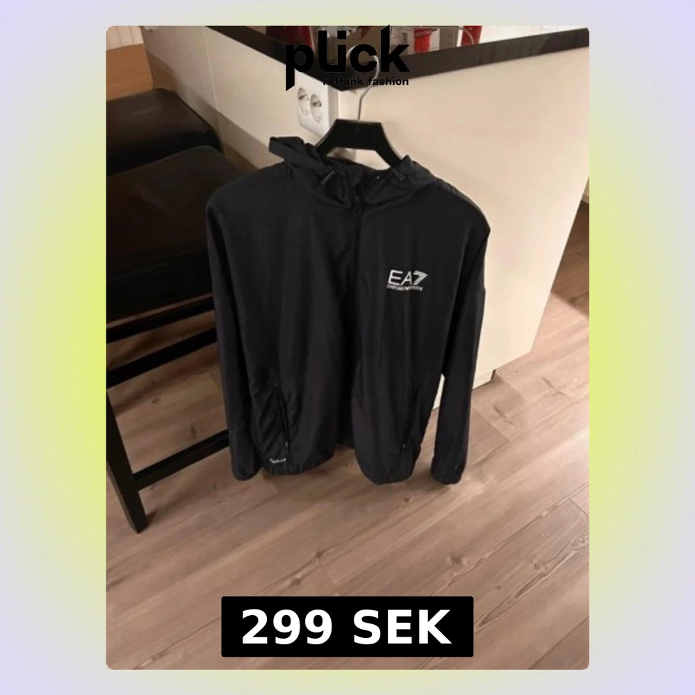 Snygg svart vindjacka från Emporio Armani EA7 med huva och dragkedja framtill. Jackan har två fickor med dragkedja och en vit logga på bröstet. Perfekt för dig som vill ha en stilren och sportig look. Den har en fläck på framsidan, som går att ta bort OBS