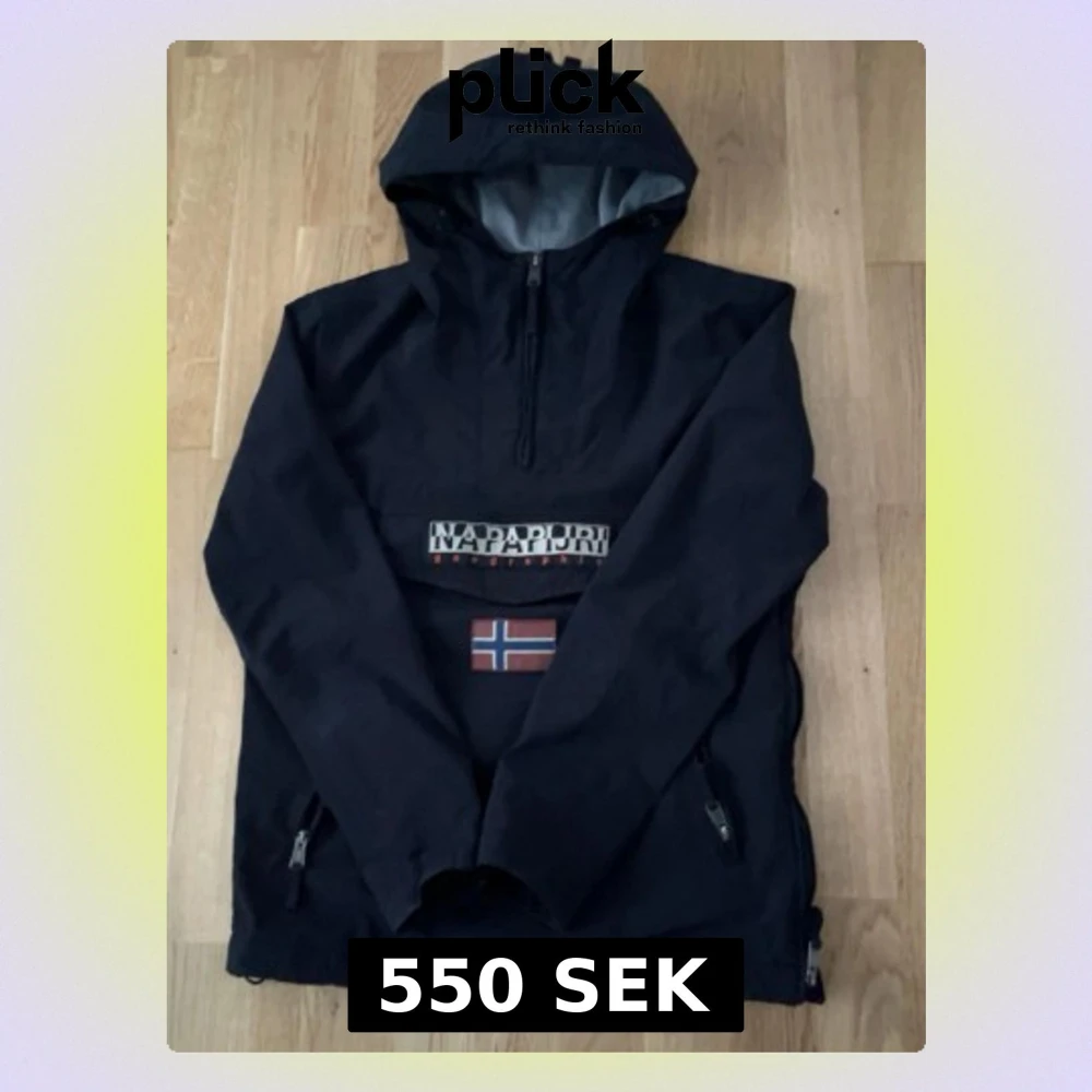 Snygg svart vindjacka från Napapijri med halv dragkedja framtill och stor huva. Jackan har en stor ficka på magen med Napapijri-logga och norsk flagga. Perfekt för blåsiga dagar och streetwear-stil.