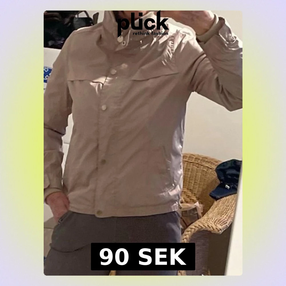 Stilren beige vindjacka med hög krage och knäppning framtill. Jackan har långa ärmar, diskreta fickor och är tillverkad i ett lätt, vindtätt material. Perfekt för blåsiga dagar och enkel att matcha med olika outfits.storlek som smal eller medium (personen på bild har medium)