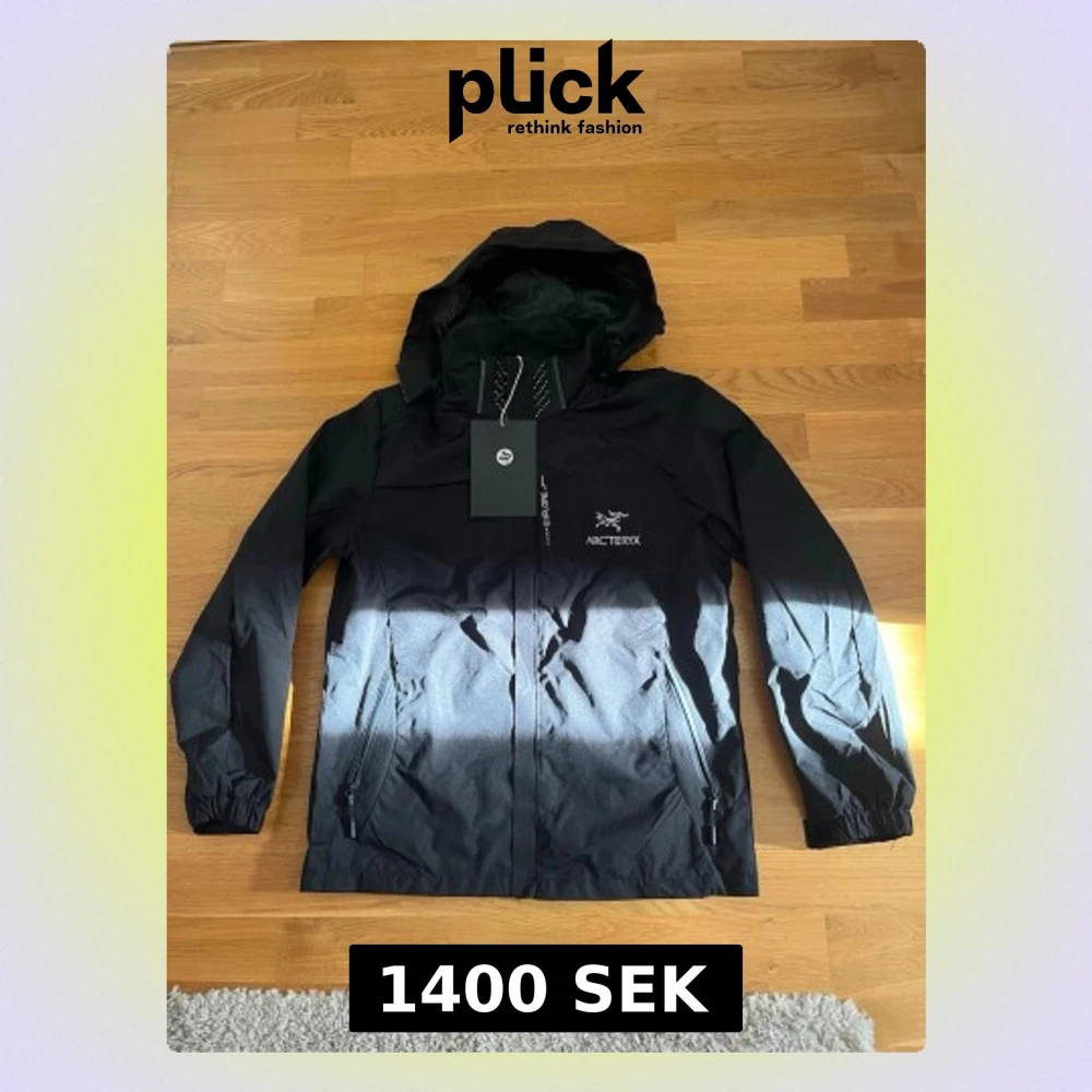 Snygg svart vindjacka från Arc'teryx med huva och dragkedja framtill. Jackan har två sidofickor med dragkedja, justerbar huva och elastiska muddar vid ärmsluten. Tillverkad i lätt och slitstarkt material, perfekt för blåsiga dagar.