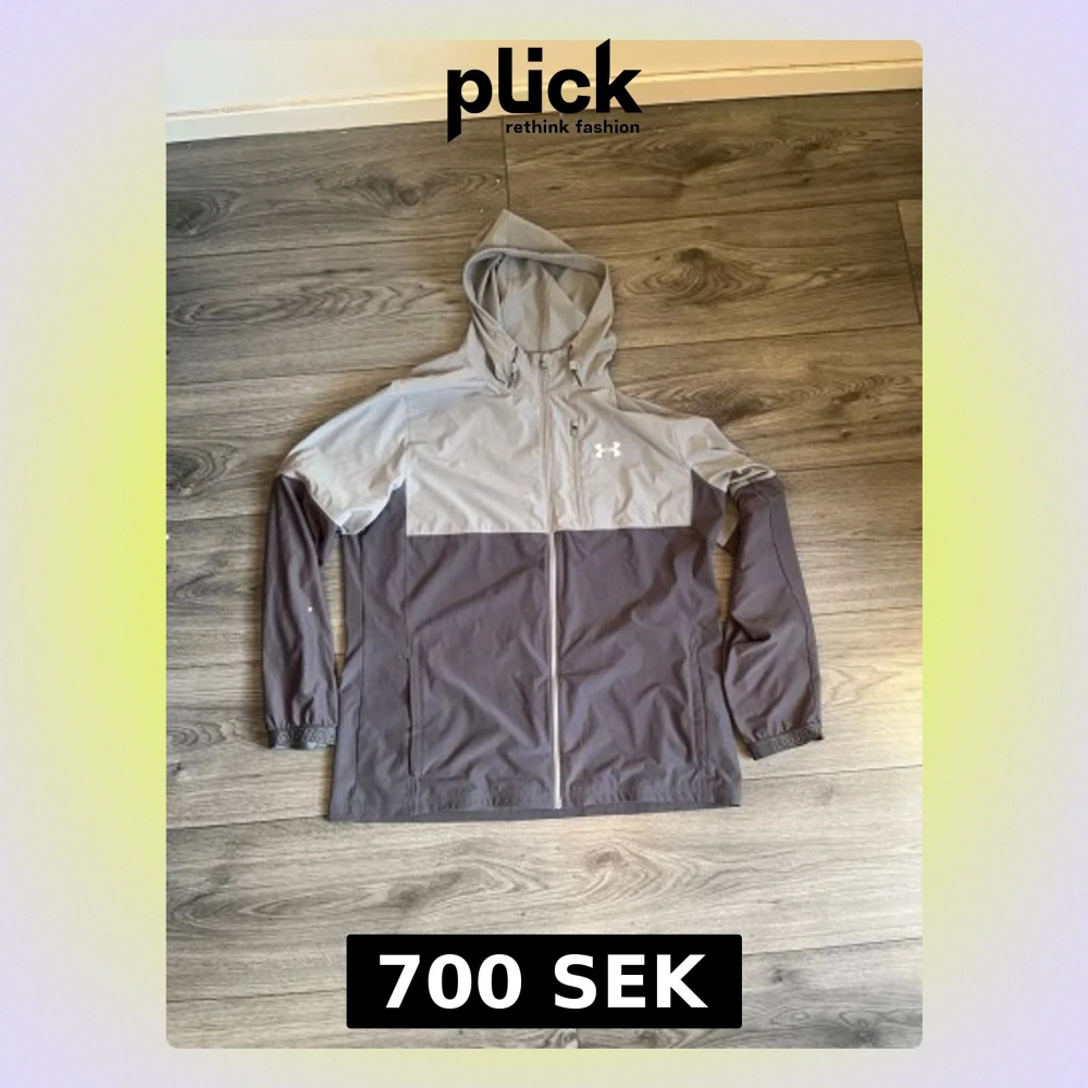 Snygg tvåfärgad grå vindjacka från Under Armour med huva och hel dragkedja framtill. Jackan har logga på bröstet, elastiska muddar och praktiska sidofickor. Perfekt för blåsiga dagar och sportiga outfits.