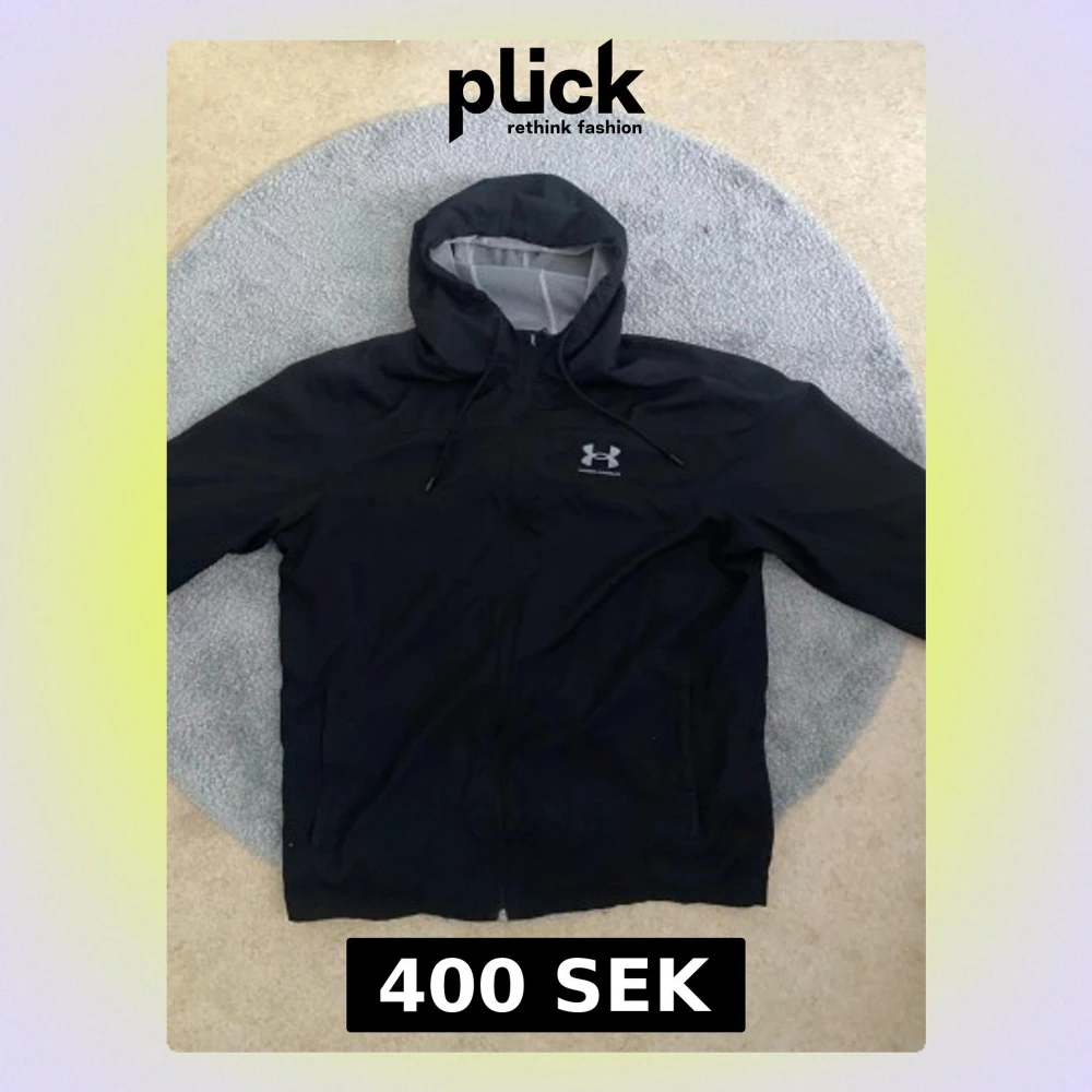 Snygg svart vindjacka från Under Armour med huva och dragsko. Jackan har meshfoder i huvan för extra ventilation och en diskret logga på bröstet. Perfekt för blåsiga dagar och enkel att matcha med olika outfits.