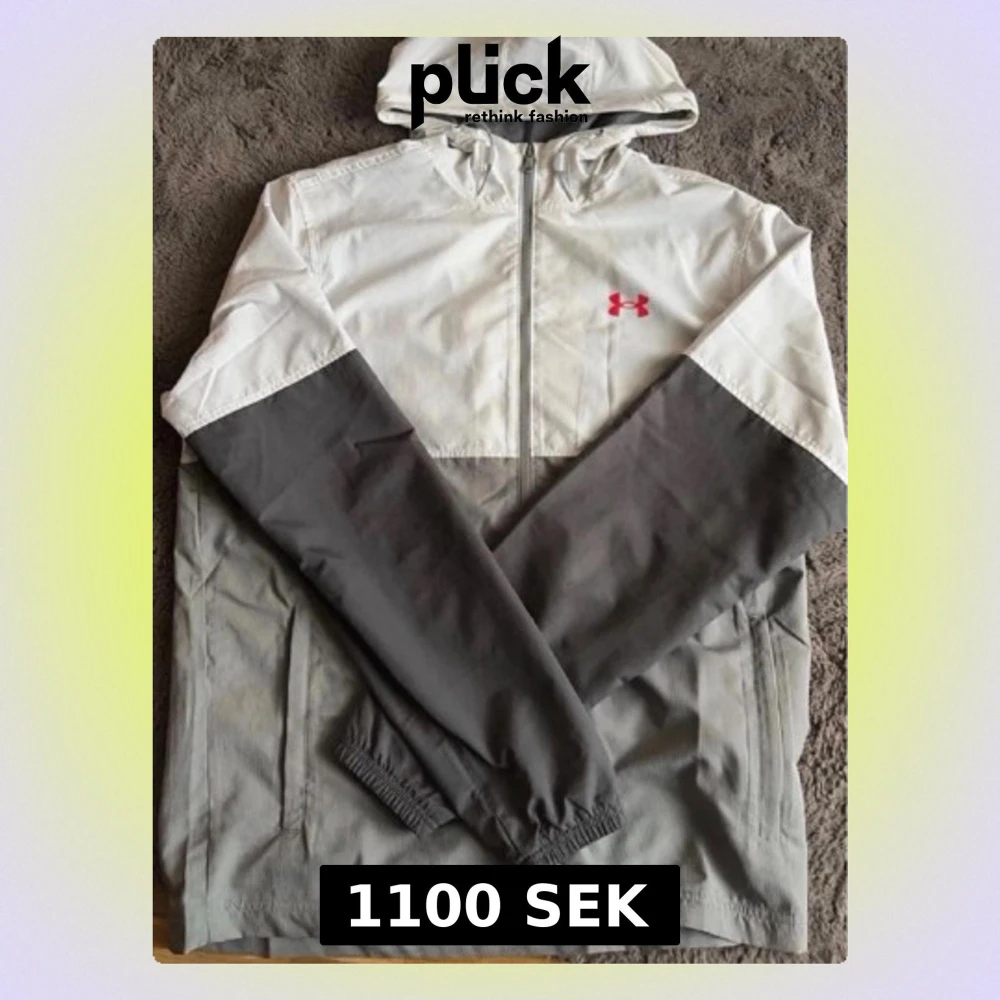 Snygg vindjacka från Under Armour i grått och vitt med dragkedja framtill och huva. Jackan har elastiska muddar vid ärmsluten och två sidofickor. Under Armour-logga i rött på bröstet. Perfekt för blåsiga dagar och sportiga outfits.