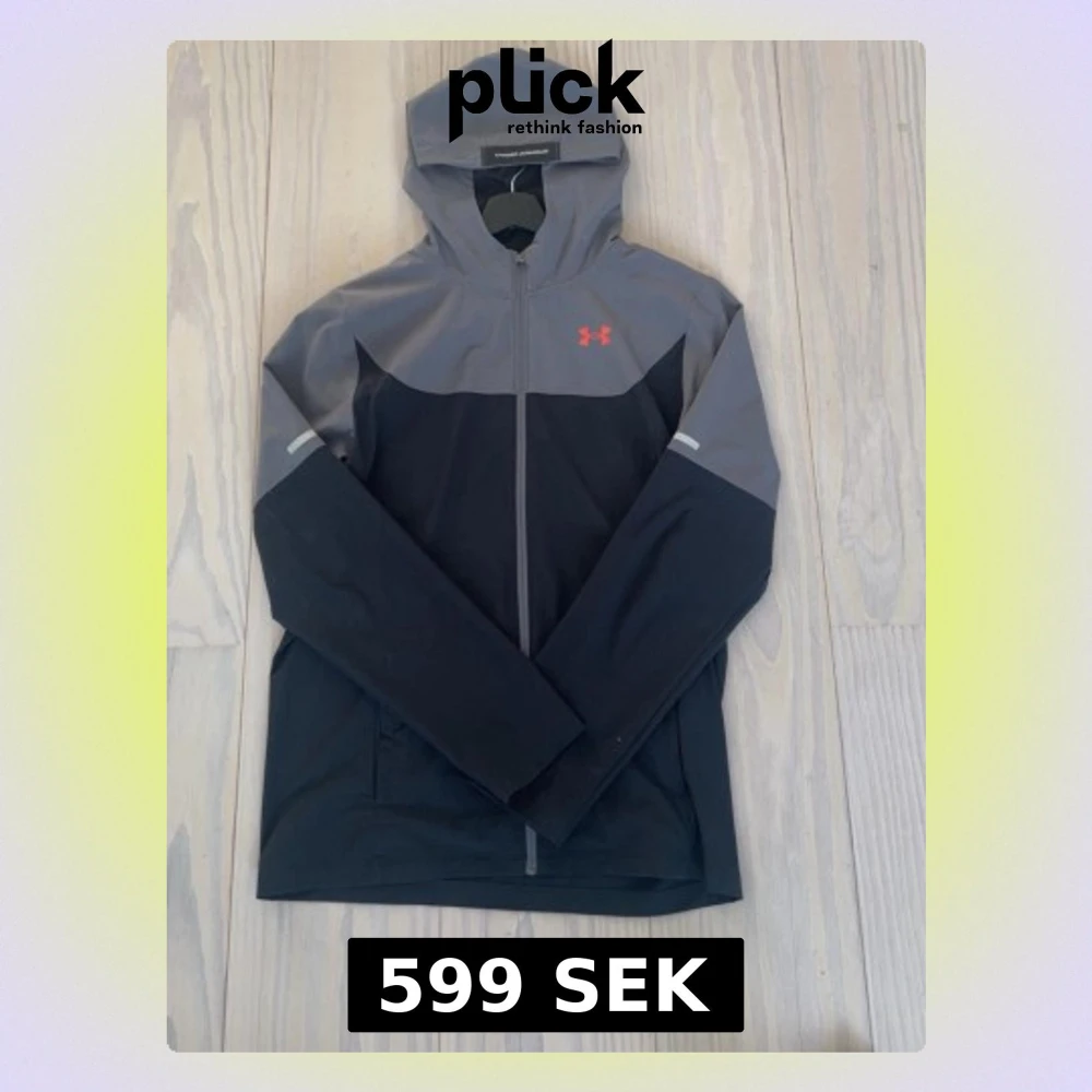 Snygg vindjacka från Under Armour i svart och grått med hel dragkedja och huva. Jackan har en röd logga på bröstet och reflekterande detaljer på ärmarna. Perfekt för blåsiga dagar och sportiga outfits.