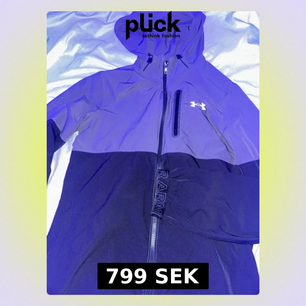 Snygg vindjacka från Under Armour i tvåfärgad design, mörkblå och ljusare blå upptill. Jackan har huva, hel dragkedja, bröstficka med dragkedja och logga på bröstet. Tillverkad i lätt och tåligt material, perfekt för blåsiga dagar.
