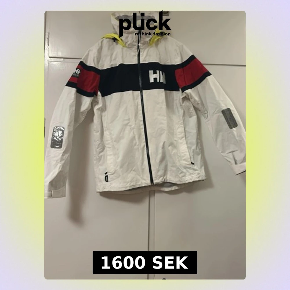Snygg vit vindjacka från Helly Hansen med svart och röd rand över bröst och armar samt gul huva. Jackan har dragkedja framtill, två sidofickor med dragkedja och HH-logga på bröstet och huvan. Perfekt för blåsiga dagar och streetwear-stil. NYPRIS 3999 KR