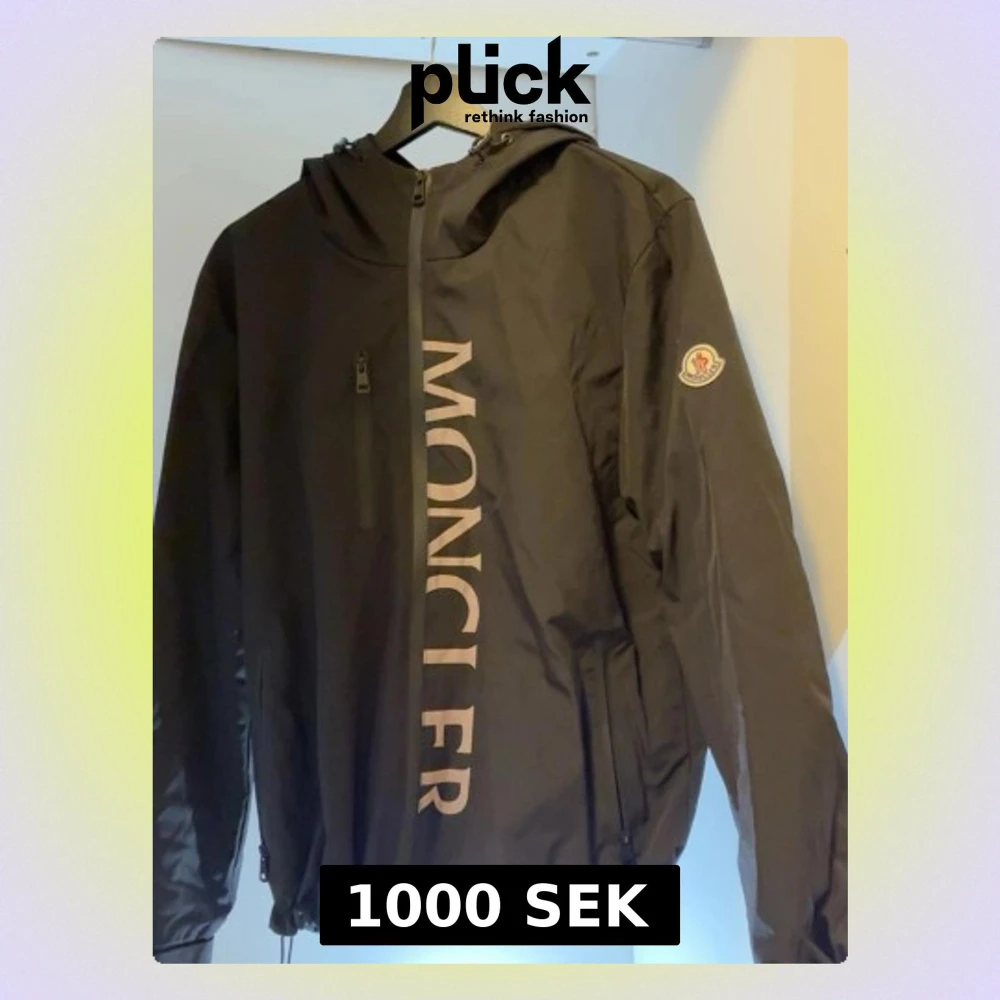 Snygg svart vindjacka från Moncler med stor logga längs dragkedjan och klassisk Moncler-patch på ärmen. Jackan har huva, dragkedjeförsedda fickor och justerbar nederkant. Tillverkad i lätt och slitstarkt material, perfekt för blåsiga dagar.