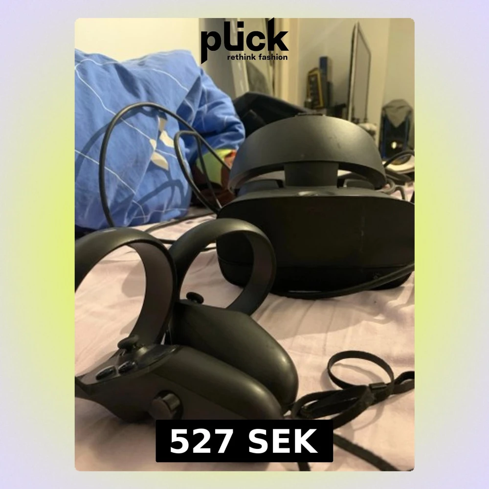 VR-headsetet Oculus Rift S i svart med tillhörande två handkontroller. Headsetet har justerbart band och ansluts med kabel. Kontrollerna är ergonomiska med flera knappar och handledsremmar. Perfekt för gaming och VR-upplevelser.ganska använd men funkar bra!