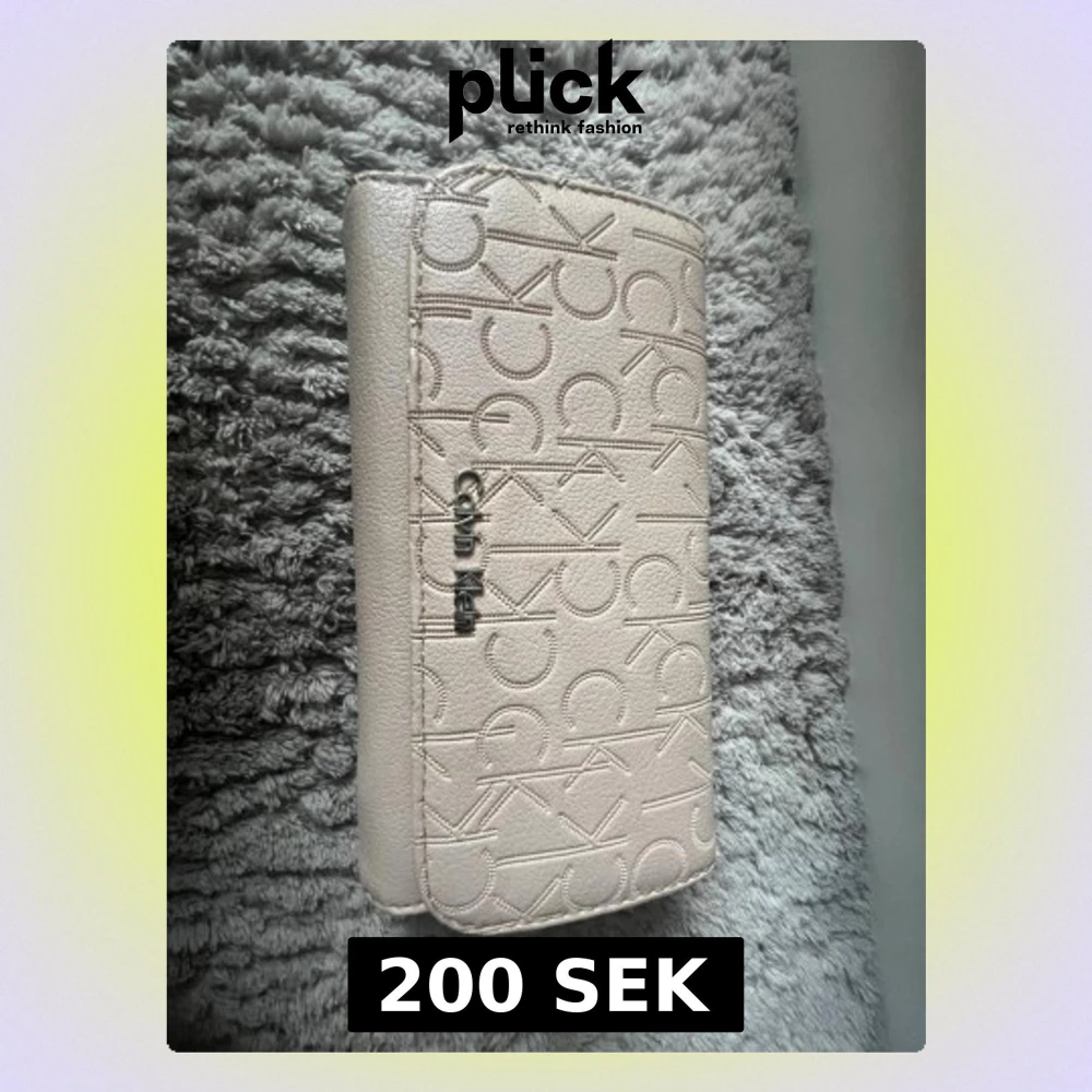 Snygg beige plånbok från Calvin Klein med präglat CK-mönster över hela ytan och metallogo framtill. Tillverkad i konstläder med stilren och modern design. Perfekt för dig som gillar klassiska accessoarer med en twist. Köpte i USA för $79,50 dollar vilket motsvarar runt 800-900 kr. Har lite skråmor men man ser inte det på utsidan. Älskar denna sååå mycket men säljer på grund av att jag inte använder längre ❤️