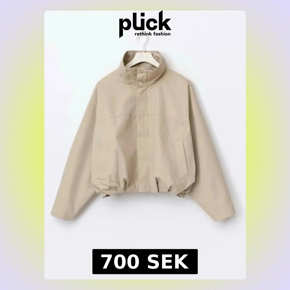 Stilren beige vindjacka med hög krage och dold dragkedja samt tryckknappar framtill. Jackan har två sidofickor och en avslappnad, boxig passform med resår i nederkant. Tillverkad i ett lätt material som passar perfekt för blåsiga dagar.