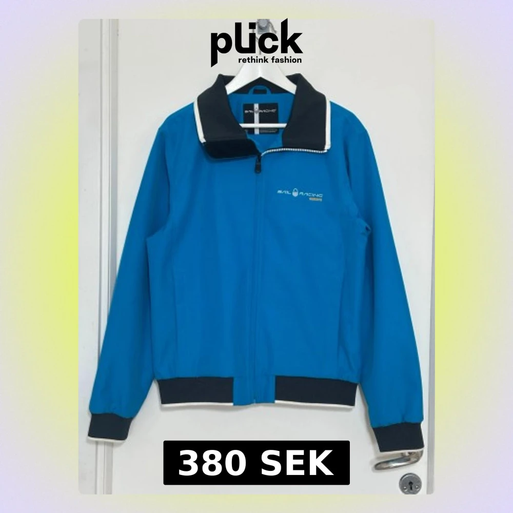 Blå vindjacka från Sail Racing med svart och vit krage, dragkedja framtill och logga på bröstet. Jackan har svarta muddar vid ärmslut och nederkant samt vita detaljer längs kragen. Tillverkad i ett lätt och vindtätt material, perfekt för blåsiga dagar.