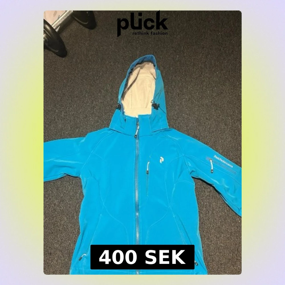 Snygg blå vindjacka från Peak Performance med huva och dragkedja framtill. Jackan har vita detaljer, två sidofickor med dragkedja och en ficka på ärmen. Insidan är fodrad med mjukt fleece-material för extra komfort.