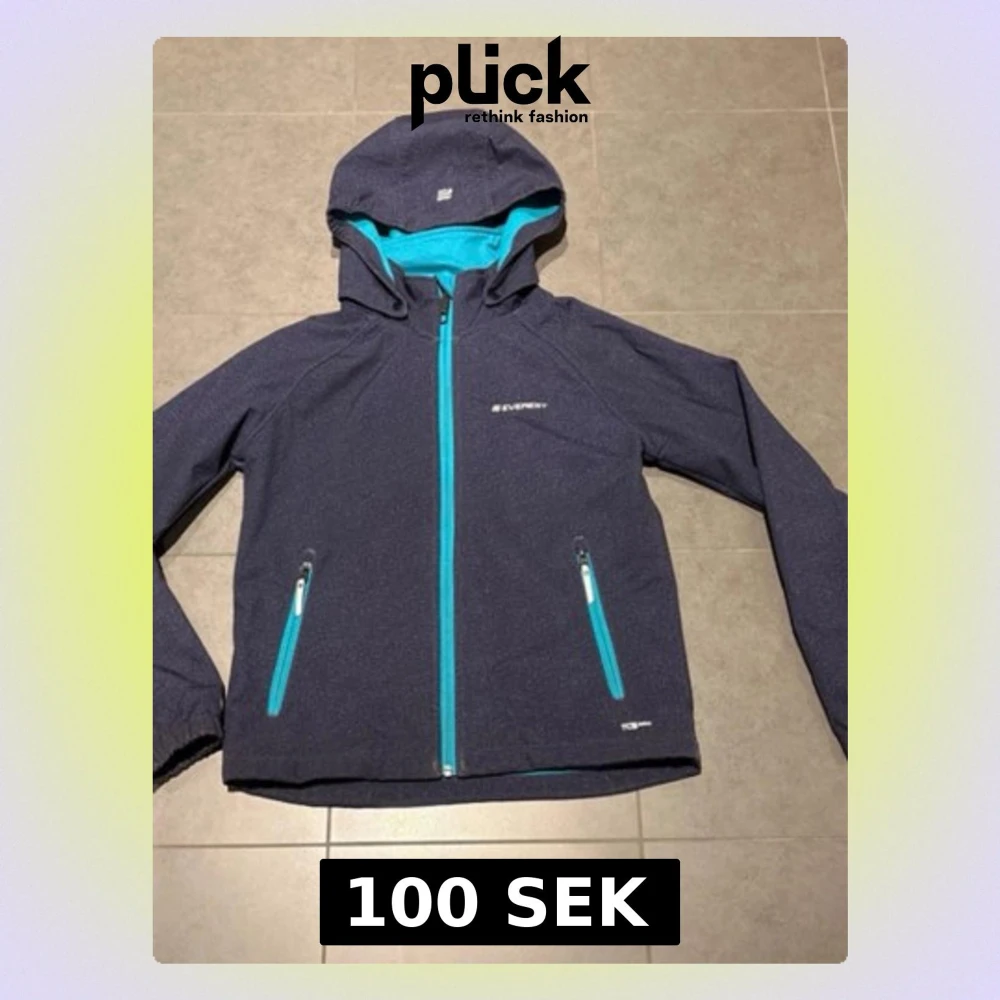 Snygg mörkblå vindjacka från Everest med turkosa detaljer, dragkedjor och innerfoder. Jackan har huva, två fickor med dragkedja och är tillverkad i ett lätt och smidigt material som passar perfekt för blåsiga dagar. Vid ena armen hsr jackan blivit lite nöt men annars i fint skick. Se bilder