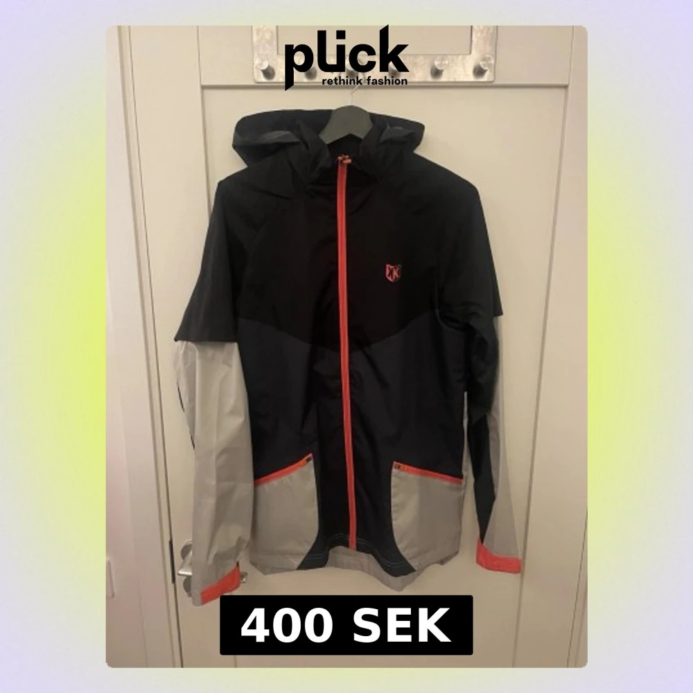 Snygg vindjacka från footkorner köpt i paris i svart och grått med röda detaljer. Jackan har huva, hel dragkedja framtill och två fickor med röda dragkedjor. Materialet är tunt och vindtätt, perfekt för blåsiga dagar. Footkorner-logga på bröstet och ryggen.