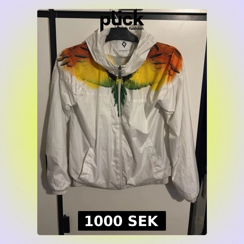 Säljer en vit Marcelo burlon vindjacka med dragkedja och huva. Jackan har ett unikt tryck av färgglada fjädrar i orange, gul och grön över axlar och bröst, som fortsätter på ryggen. Två fickor framtill och muddar. Perfekt för dig som vill sticka ut.