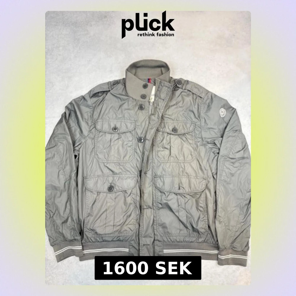 Stilren grå vindjacka från Moncler med fyra stora fickor framtill, hög krage och ribbade muddar. Jackan har knapp- och dragkedjestängning samt diskret logga på ärmen. Tillverkad i lätt och tåligt material, perfekt för blåsiga dagar.