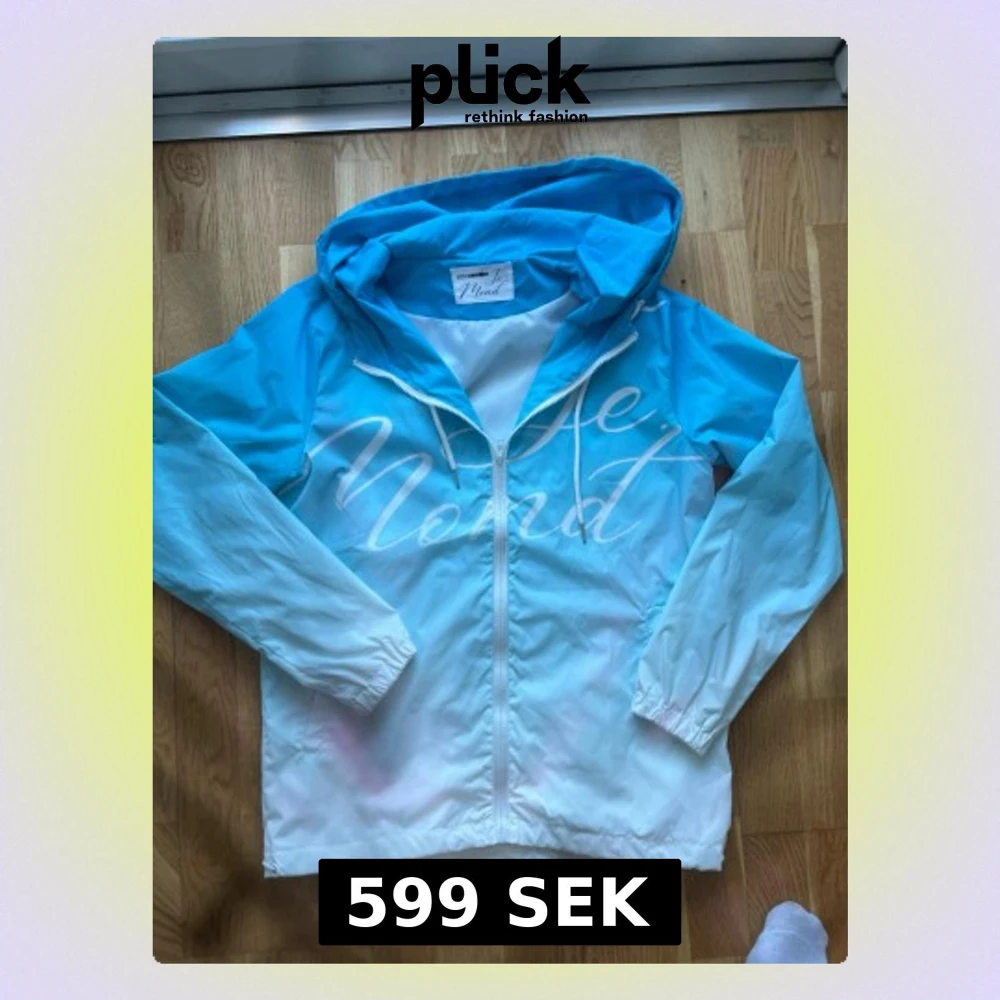 Snygg vindjacka från Le Nörd i blått och vitt med stor logga framtill. Jackan har huva med dragsko, hel dragkedja och elastiska muddar vid ärmsluten. Tillverkad i lätt och tunt material, perfekt för blåsiga dagar. Storlek L men passar M