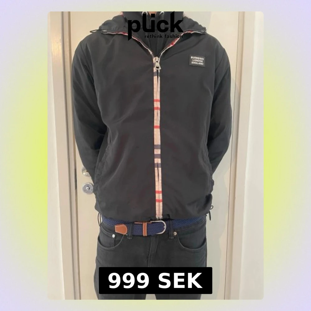 Stilren svart vindjacka från Burberry med klassiskt rutigt mönster längs dragkedjan och liten logotyp på bröstet. Jackan har huva med dragsko, två sidofickor och justerbar nederkant. Perfekt för dig som vill ha en snygg och tidlös look.