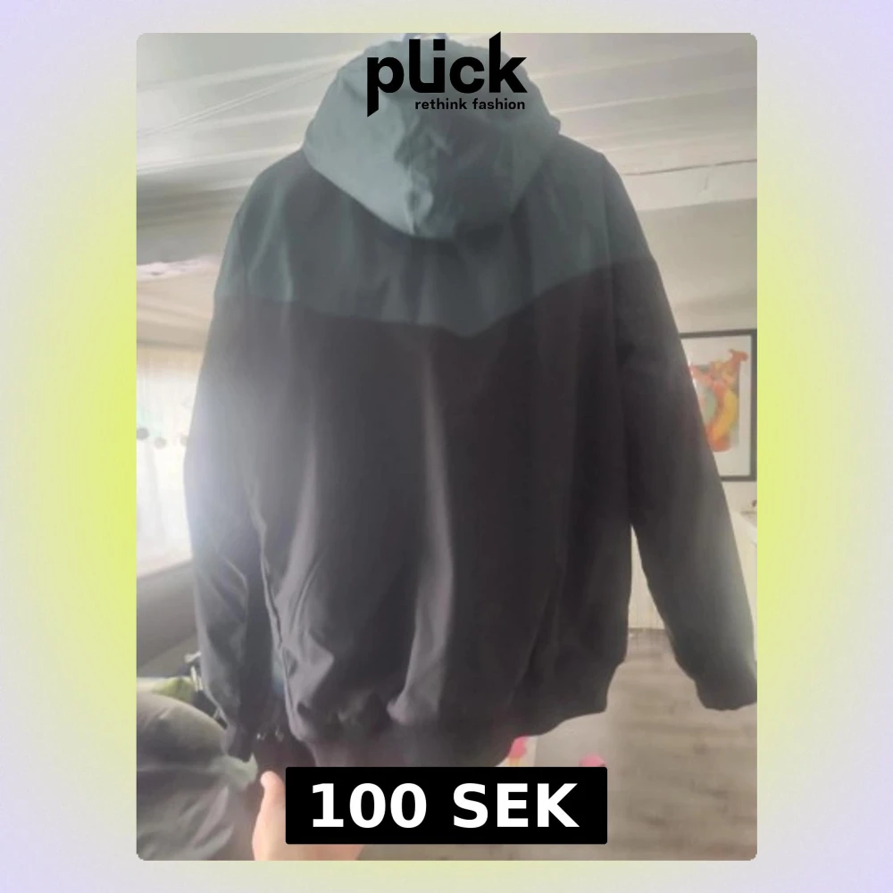 Snygg vindjacka i svart och mörkgrönt med dragkedja framtill och två fickor med dragkedja. Jackan har en justerbar huva och muddar vid ärmslut och nederkant. Perfekt för blåsiga dagar och enkel att matcha med olika outfits. Finns något hål på ärmen annars bra skick