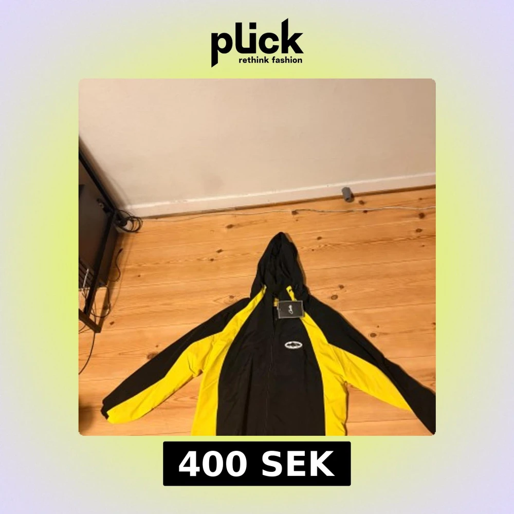 Svart och gul vindjacka från Corteiz med huva och coola kontrastpaneler. Jackan har dragkedja framtill, snörning vid huvan och ett broderat märke på bröstet. Materialet är lätt och syntetiskt, perfekt för att sticka ut med streetstyle-vibe.
