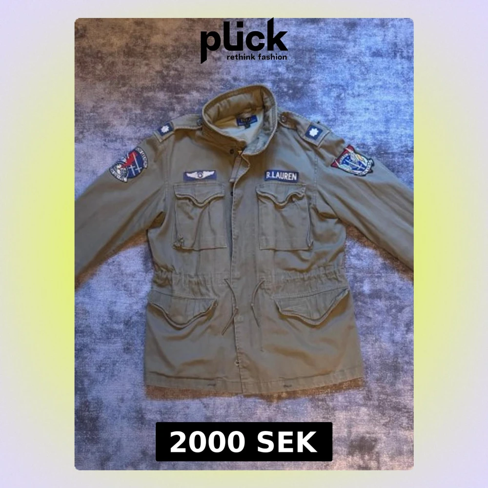 Militärgrön jacka från Polo Ralph Lauren med patchar på ärmar och bröst. Jackan har fyra fickor framtill, dragsko i midjan och ståkrage. Materialet är bomull och jackan har detaljer som knappar och dragkedja. Märket R.Lauren syns tydligt på bröstet.