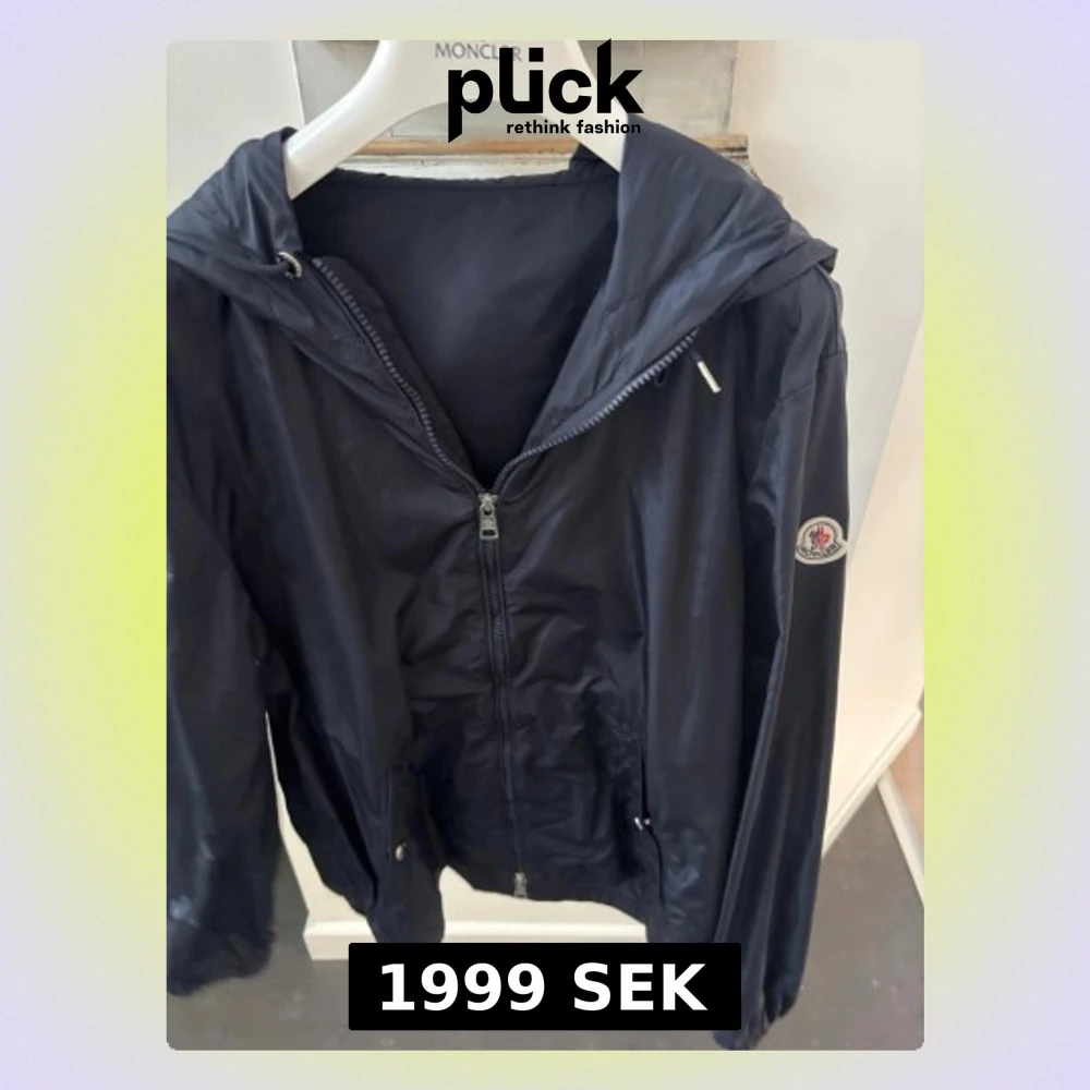 Snygg marinblå vindjacka från Moncler med huva och dragkedja framtill. Jackan har Moncler-logga på ärmen och diskreta fickor med tryckknappar. Materialet är tunt och lätt, perfekt för blåsiga dagar. Ärmen har en randig detalj i rött, vitt och blått.