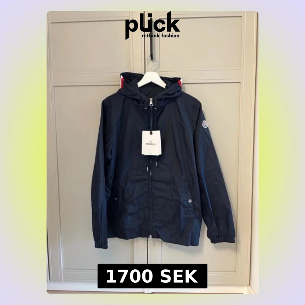 Snygg marinblå vindjacka från Moncler med huva och dragkedja framtill. Jackan har vita och röda detaljer på huvan samt Moncler-logga på ärmen. Tillverkad i lätt, vattenavvisande material och har två fickor med knappstängning. Perfekt för blåsiga dagar.