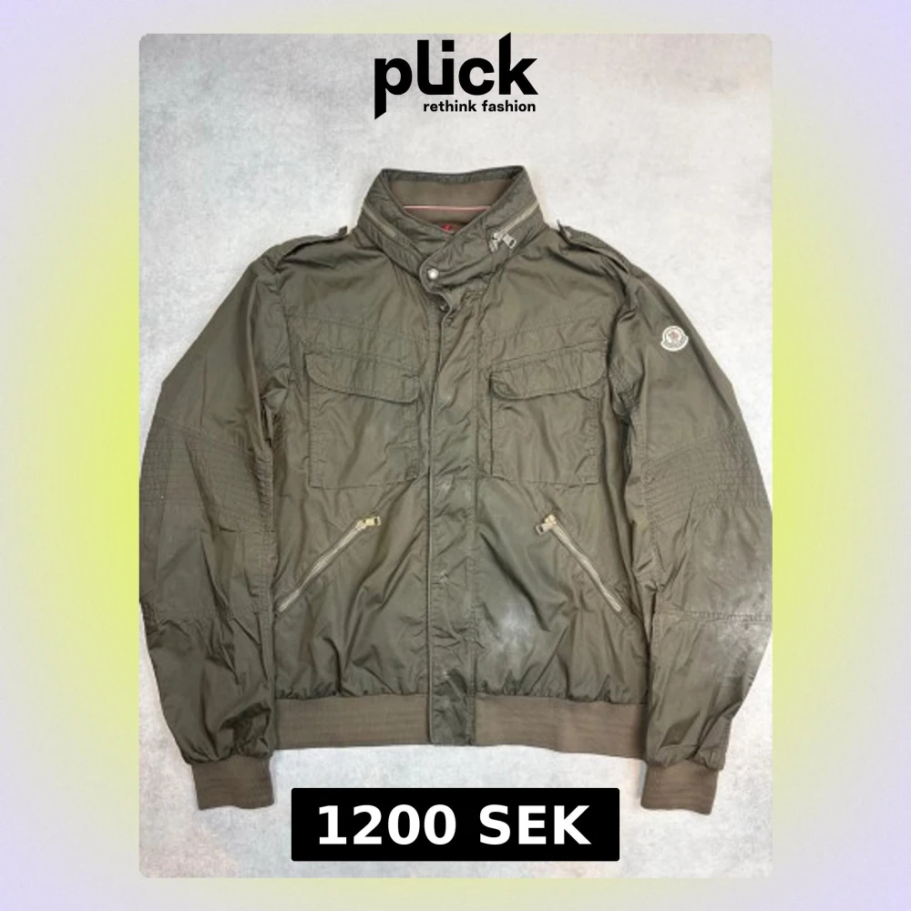 Snygg olivgrön vindjacka från Moncler med hög krage, dragkedja och knappstängning. Jackan har två bröstfickor med lock, två snedställda fickor med dragkedja och ribbade muddar vid ärmslut och nederkant. Moncler-logga på vänster ärm. Tillverkad i lätt, vindtätt material.