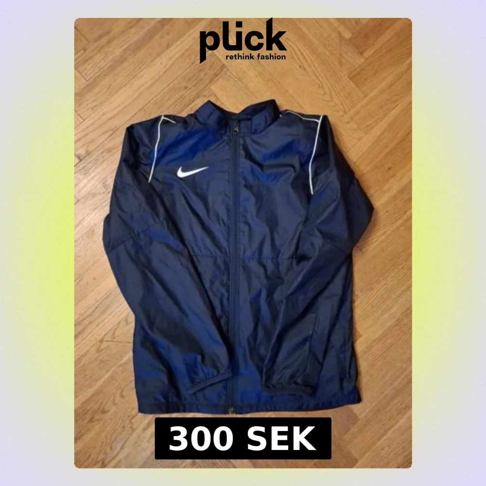 Snygg mörkblå vindjacka från Nike med hel dragkedja framtill och vita detaljer på axlarna. Jackan har hög krage och klassisk sportig design, perfekt för blåsiga dagar. Tillverkad i lätt och tåligt material.