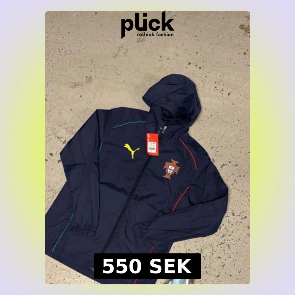 Snygg mörkblå vindjacka från Puma med Portugals landslagsemblem på bröstet. Jackan har huva, hel dragkedja och detaljer i gult, grönt och rött. Perfekt för dig som vill ha sportig stil och visa ditt stöd för Portugal.