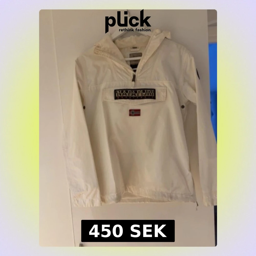 Snygg vit vindjacka från Napapijri med halv dragkedja, huva och stor ficka framtill med logga och norsk flagga. Jackan har elastiska muddar och är tillverkad i ett lätt och slitstarkt material, perfekt för blåsiga dagar.