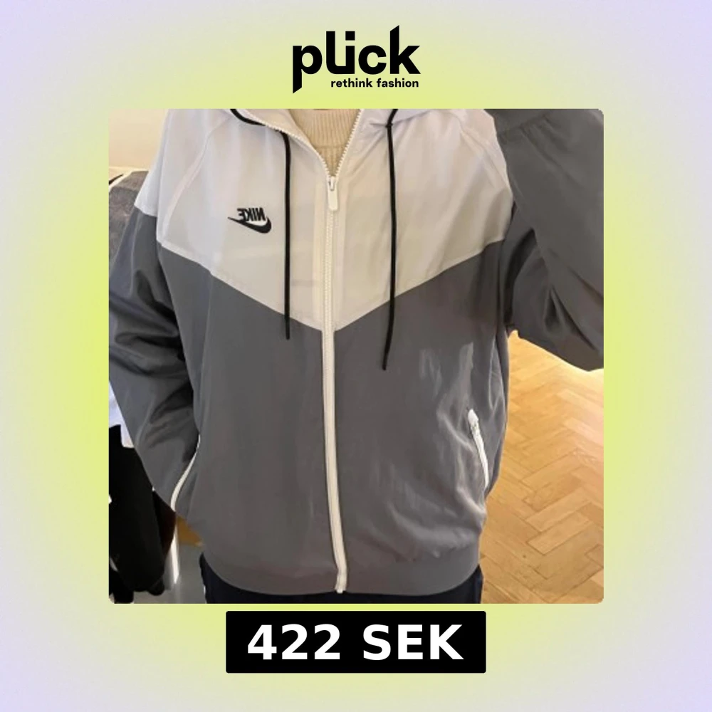 Snygg grå och vit vindjacka från Nike med dragkedja och huva. Jackan har en klassisk design med två fickor framtill och justerbara snören vid huvan. Perfekt för en sportig look.💘