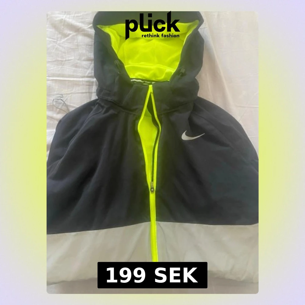 Nike vindjacka med huva i svart, vitt och neon-gult. Jackan har dragkedja framtill, meshfoder och justerbar huva. Swoosh-logga på bröstet och elastiska muddar vid ärmslut. Perfekt för blåsiga dagar och sportiga outfits.