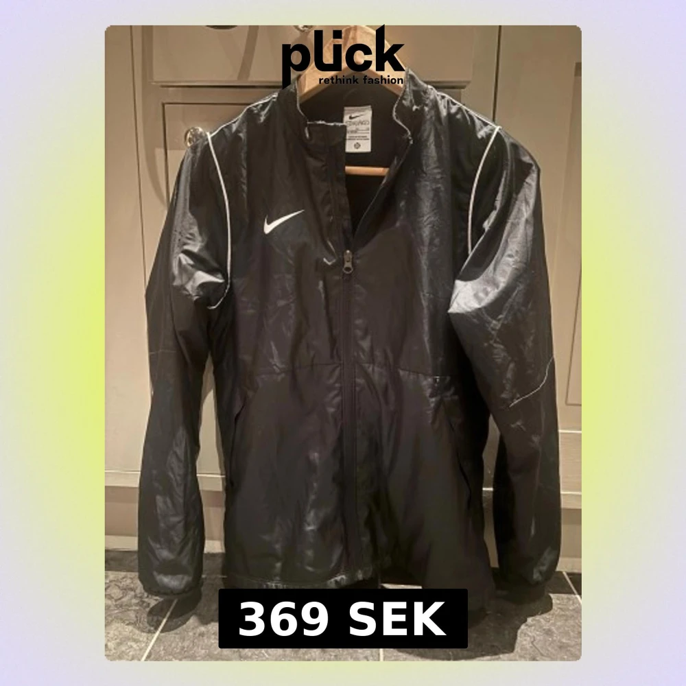 Snygg svart vindjacka från Nike med vit logga på bröstet och tunna vita detaljer längs axlarna. Jackan har hel dragkedja framtill, ståkrage och meshfoder på insidan för extra komfort. Perfekt för blåsiga dagar och sportiga outfits.