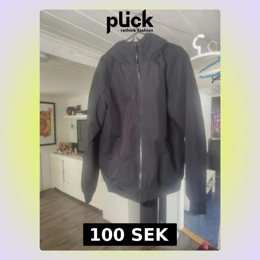 En stilren svart vindjacka med dragkedja framtill och praktisk huva. Jackan har långa ärmar och resår vid ärmslut och nederkant. Perfekt för blåsiga dagar och enkel att matcha med olika outfits.