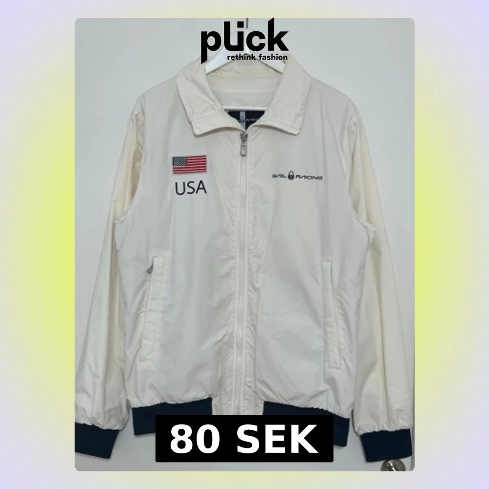 Vit vindjacka från Sail Racing med broderad USA-flagga och texten 'USA' fram samt 'UNITED STATES' och flagga bak. Jackan har dragkedja, två fickor och mörkblå muddar vid ärmslut och nederkant.
