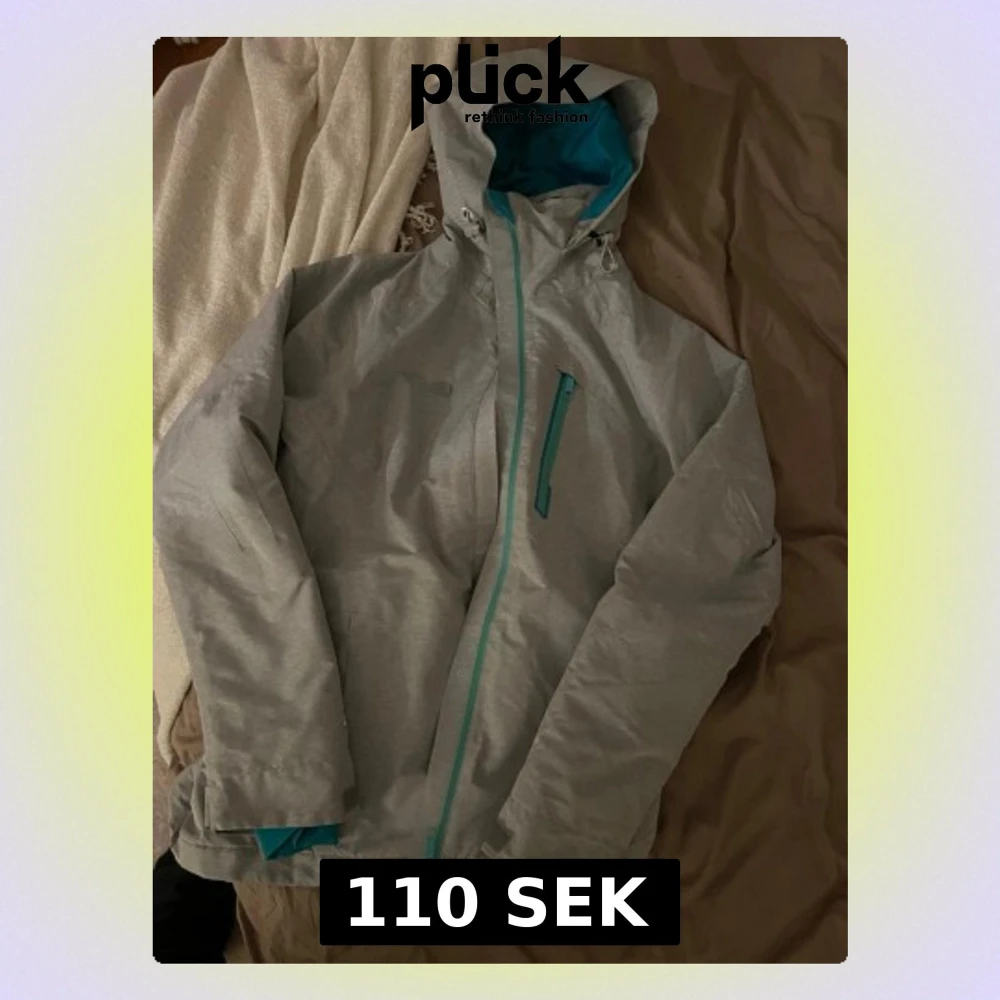 Skidjacka köpt från vinted. Ljusgrå på utsidan och turkos inuti samt dragkedja. Använt 2-3 gånger men säljer nu pågrund av att jag inte kan åka längre🩷 skulle säga den är i storlek S-M💕