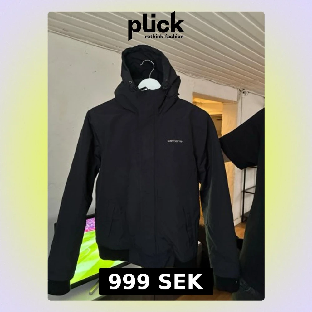 Snygg svart vindjacka från Carhartt med huva och dragkedja framtill. Jackan har två stora fickor, ribbade muddar och Carhartt-logga på bröstet. Tillverkad i slitstarkt syntetmaterial som står emot vind och regn. Nypris 2300:-